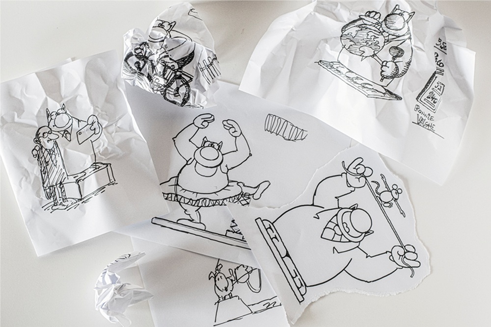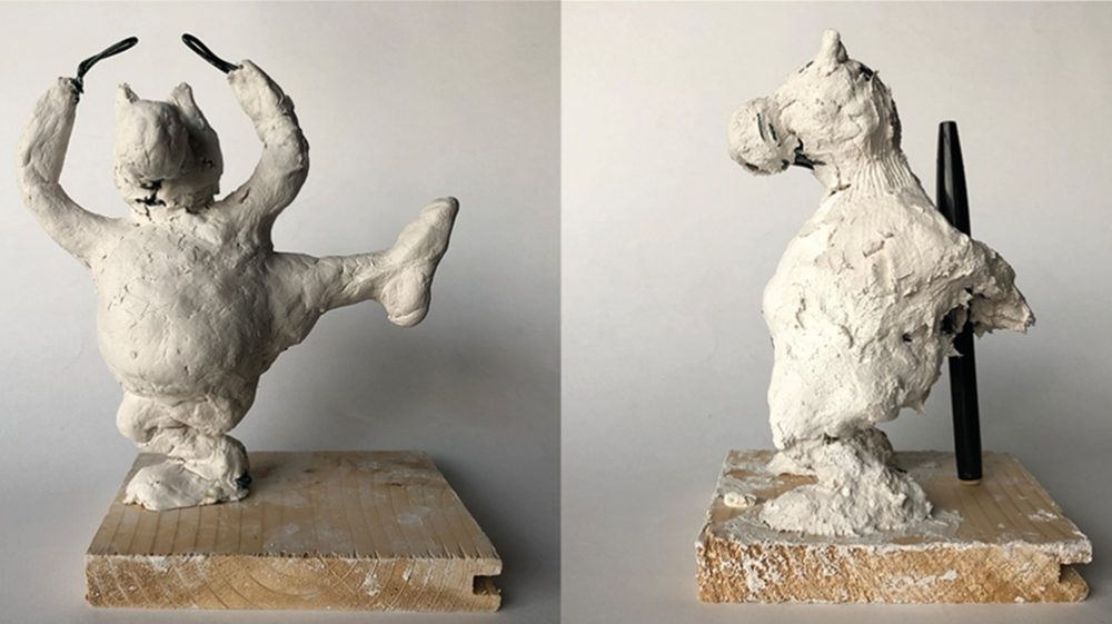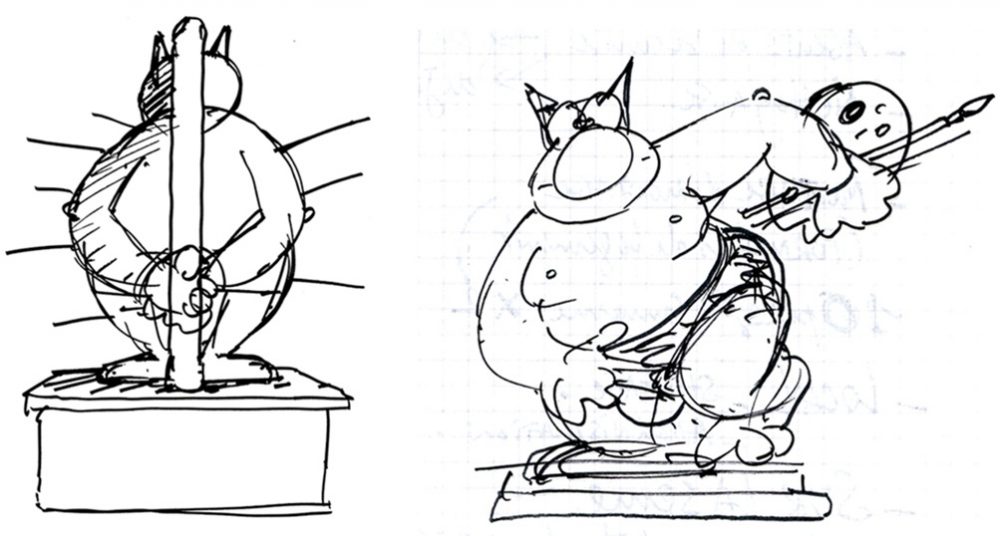 Une image, c’est d’abord une idée qui jaillit dans ma tête, et l’envie de transformer la scène en sculpture commence obligatoirement par une série de dessins, histoire d’imaginer l’objet en volume, vu de tous les côtés…