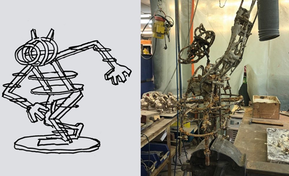 Sur base de la figurine en fil de fer et de mes croquis, François Deboucq et son équipe vont souder un « squelette » en barres d’acier qui fera office d’ossature de la sculpture.
