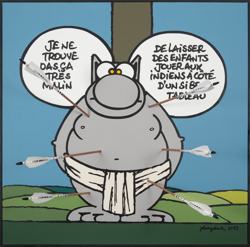 Cette sculpture du Chat, inspirée du Martyre de Saint-Sébastien, est particulièrement importante pour Philippe Geluck. Il a voulu, à travers elle, rendre hommage à ses amis et confrères, dessinateurs ou journalistes victimes de la répression et du terrorisme.