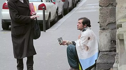 Dans les beaux quartiers de la capitale, un clochard s’approche d’une femme distinguée qui est en train de faire du lèche-vitrines.