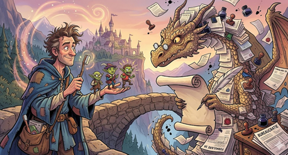 Un matin, Barnabé se retrouva face à un « Dragon de Bureaucratie ». Ce n’était pas un dragon cracheur de feu classique, mais une créature recouverte d’écailles en papier carbone qui exigeait trois formulaires signés avant de vous laisser traverser le pont.
