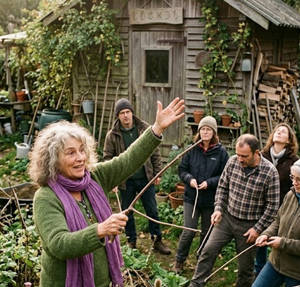 Mme Cendrine Radis-Thésie exerce la divination à l’aide de sa baguette, dans une vielle cabane de jardin reconvertie en temple de la vibration, où l’odeur de l’encens lutte courageusement contre celle du terreau humide.