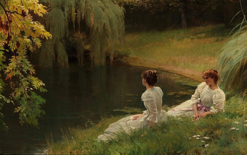 Deux jeunes femmes en robes blanches se reposent au bord d’un étang paisible, l’une contemplant l’eau, l’autre tournée vers son amie. Les doux plis de leurs robes évoquent les branches retombantes des saules pleureurs, tandis que la nature luxuriante et les reflets sereins créent une belle harmonie entre les silhouettes humaines et le paysage, caractéristique du style du peintre.