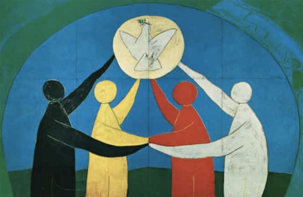 La composition monumentale de 100 m2, 300 dessins préparatoires et 18 panneaux d’isorel vissés, réunit trois œuvres importantes de l’après-guerre, « La Guerre » et « La Paix », deux œuvres peintes en 1952 auxquelles se joint une troisième « Les Quatre parties du Monde », peinte en 1957.