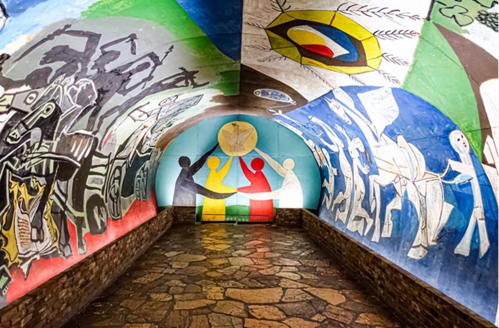 Au symbole riche et généreux de la maternité s’ajoute celui de la culture libératrice, mise à mal dans le panneau opposé. Dans un vaste pan de couleur bleue qui occupe une grande partie du mur, cohabitent plusieurs scènes, toutes empreintes d’une joie exubérante.
