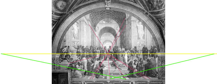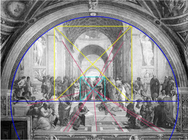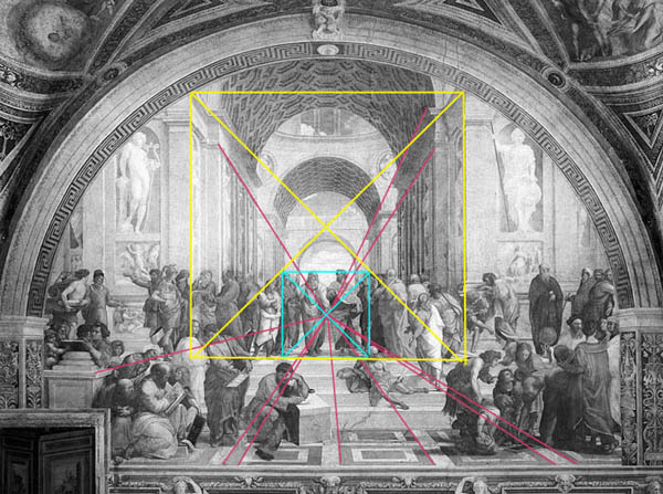 Le point de fuite principal est le centre d’un carré (en bleu) limité en hauteur par les deux personnages centraux, Platon et Aristote et en largeur par les verticales de la dernière arcade. À partir de la base du carré bleu et des parallèles à ses diagonales passant par deux de ses sommets, on obtient le carré jaune, de côté trois fois plus grand, inscrit dans le demi-cercle qui encadre la fresque.