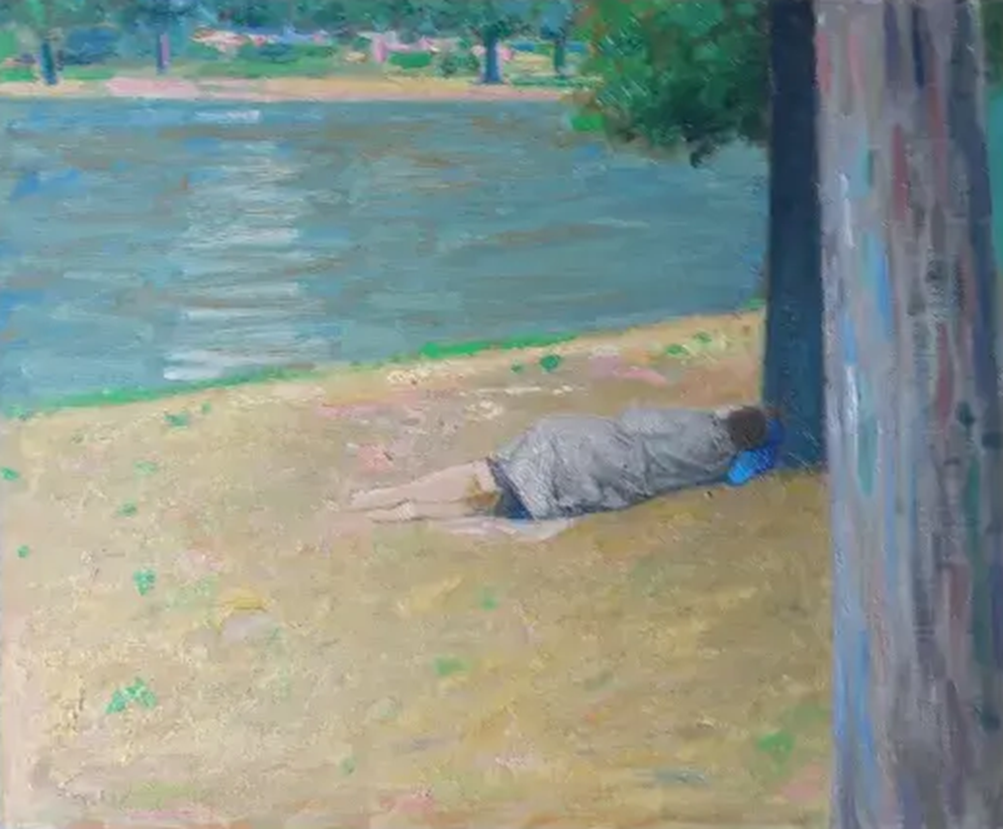 La silhouette endormie, tournée vers le lac, semble s’être glissée dans l’image comme en retrait du monde. Rien ne la regarde, rien ne la désigne, rien de bouge. Et pourtant, c’est elle qui organise silencieusement l’espace.