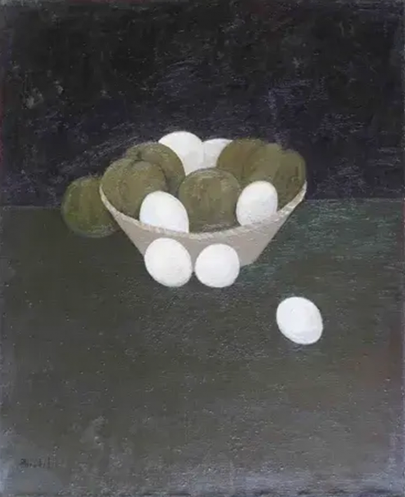 En intitulant l’œuvre Panier aux œufs et non Panier d’œufs ou Œufs et pommes, Berdal nous oriente vers ce qui est important dans sa composition : le panier est le temps qui contient l’homme et l’oriente inexorablement vers la maturité irréversible. Les œufs sont le symbole de la protection divine et d’une possible évasion/résurrection.