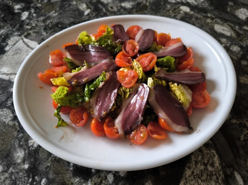 Assiètte périgourdine à ma façon (tomates cerises, sucrine, gésiers de canards, tranches de magret de canards séchées et fumées)
