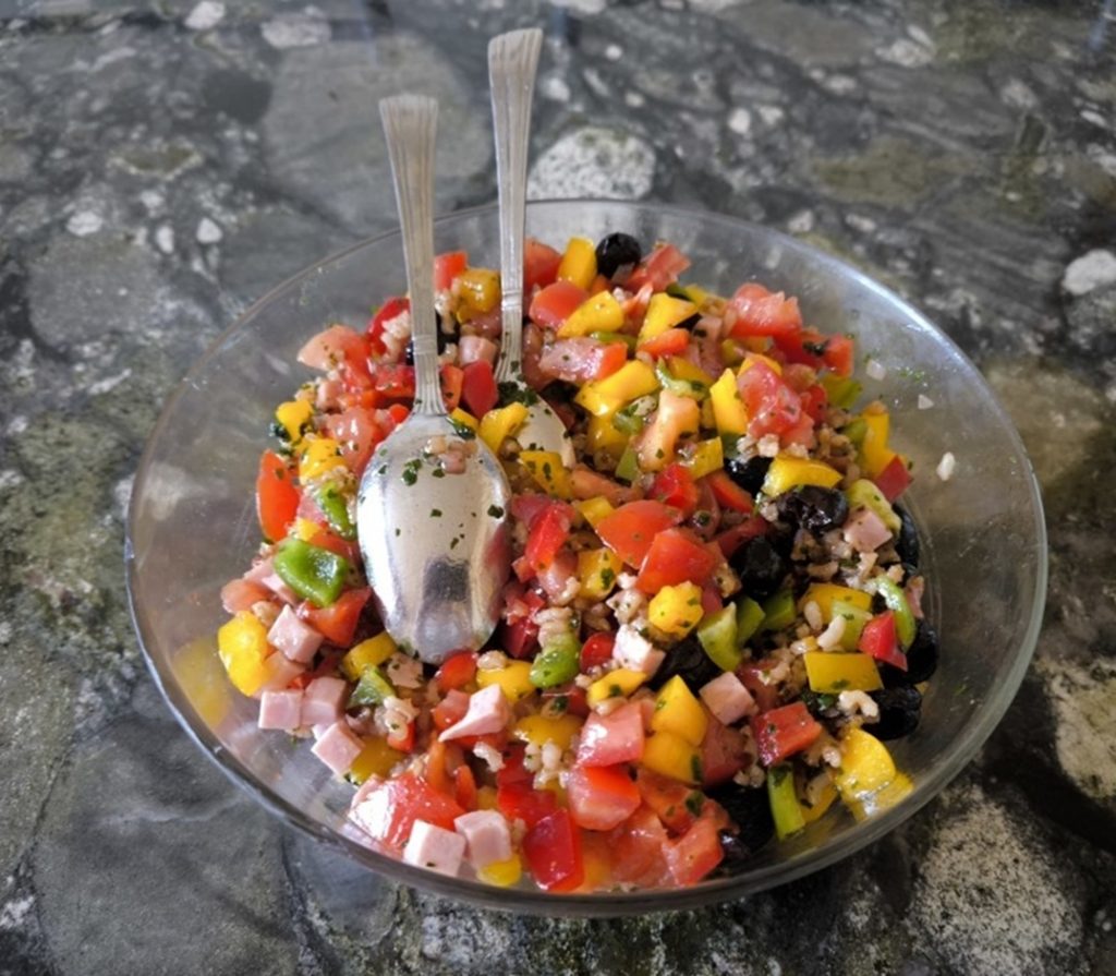 Salade composée (riz – olives – dés de jambon – tomates – poivrons)